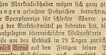 In der Ausgabe vom 14.11.1881 wird eine Postkarte erwähnt, die in 79 Tagen um die Welt gereist ist. (Artikel „Ausstellung von Postwerthzeichen“.) Spätestens 1881 gab es also eine Postkarte, die die 80 Tage unterboten hat, d. h. in weniger als 80 Tagen um die Welt gereist ist. Wenn ich es richtig verstanden habe, waren die in Thadewalds Artikel genannten Karten alle länger unterwegs (und alle in früheren Jahren abgeschickt worden).