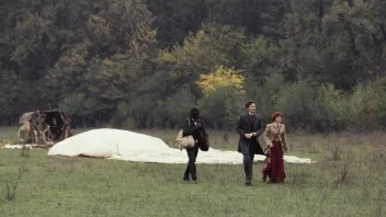 Nach erfolgreicher Alpenüberquerung haben Phileas Fogg (David Tennant, M.), Abigail Fix (Leonie Benesch, r.) und Passepartout (Ibrahim Koma, l.) mit ihrem Heißluftballon eine Bruchlandung auf einer Wiese in Italien hingelegt.