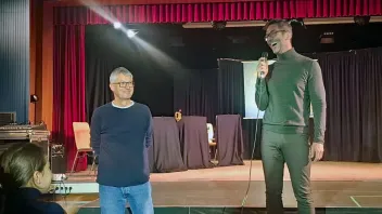 Schulleiter Christoph Droste eröffnete heute an der Gesamtschule Schermbeck gemeinsam mit Musiklehrer Edgar Möllmann, der die schulische Organisation übernommen hatte, das Gastspiel der Tourneeproduktion „In 28 Tagen durch Europa“. Foto: Ralf Meier