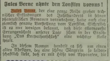 Hier mal ein ganz frühes Beispiel, wo behauptet wird, Jules Verne habe den Tonfilm vorhergesehen, Silesia vom 14.8.1931, S. 333 in der PDF:
